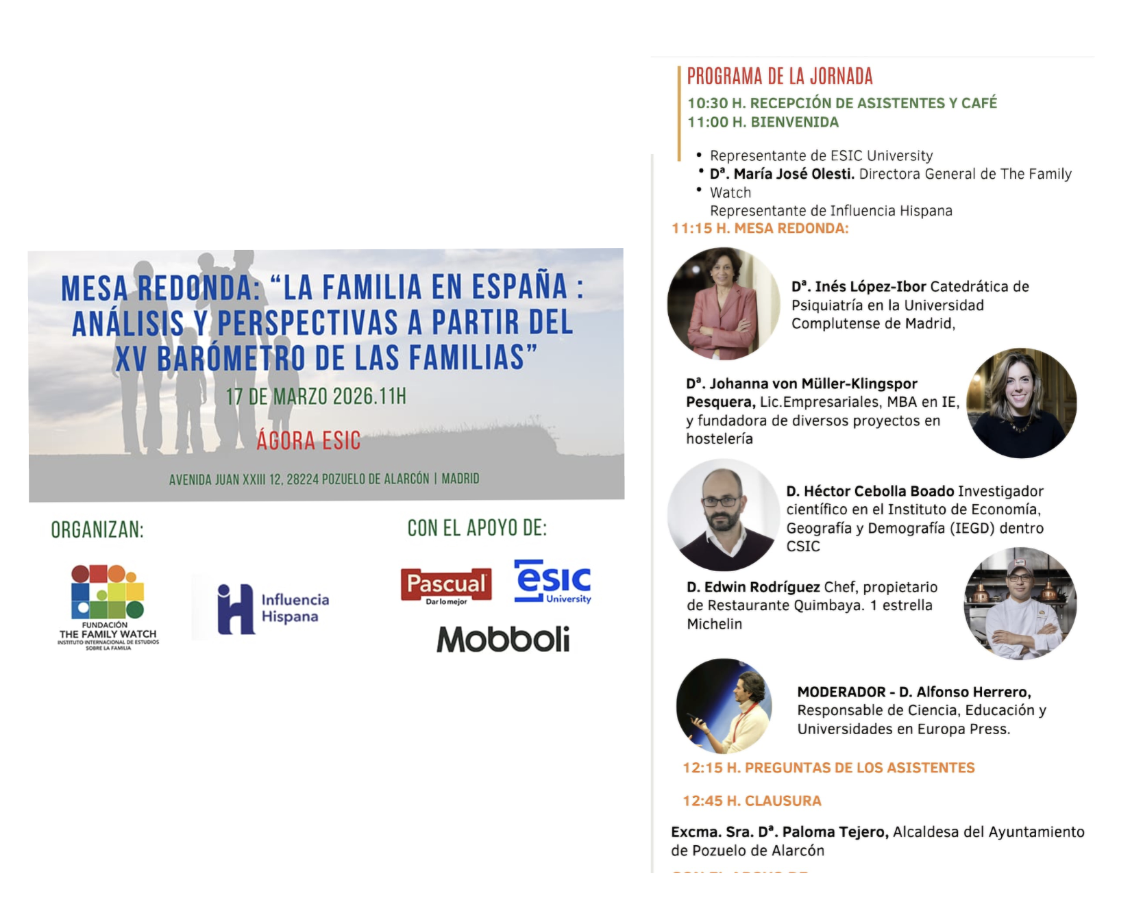 El martes 17 de marzo ha tenido lugar la mesa redonda «La familia en España: análisis y perspectivas a partir del XV Barómetro de las familias», organizada por la Fundación The Family Watch y la organización Influencia Hispana en ESIC.